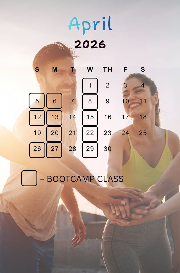 Join our inclusive community bootcamps designed for individuals of all fitness levels! Whether you're a beginner looking to kickstart your fitness journey or a seasoned athlete aiming to enhance your skills, I provide tailored workouts that accommodate everyone's needs. Enjoy a supportive environment where you can challenge yourself, meet new friends, and achieve your fitness goals together. Embrace the spirit of teamwork and personal growth—come and experience the energy of our bootcamp today!